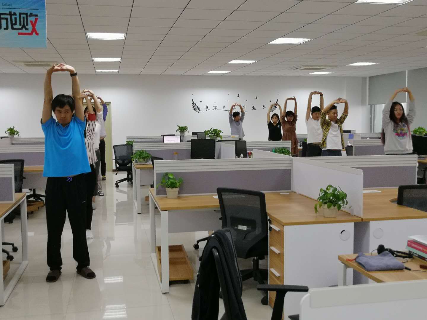 “現(xiàn)在開始做聚進第一套辦公室保健操,預備起”,熟悉的旋律在辦公室內(nèi)響起,做操的也不是學生,而是一群辦公室信息技術工程師。身份換了,目的沒變,都是鍛煉身體。只是人年紀增長了,不如學生時代那么自然,有人似乎覺得不好意思,“輕描淡寫”地晃胳膊扭腰,但在運動大使的糾正下,他們動作也在逐漸規(guī)范。
