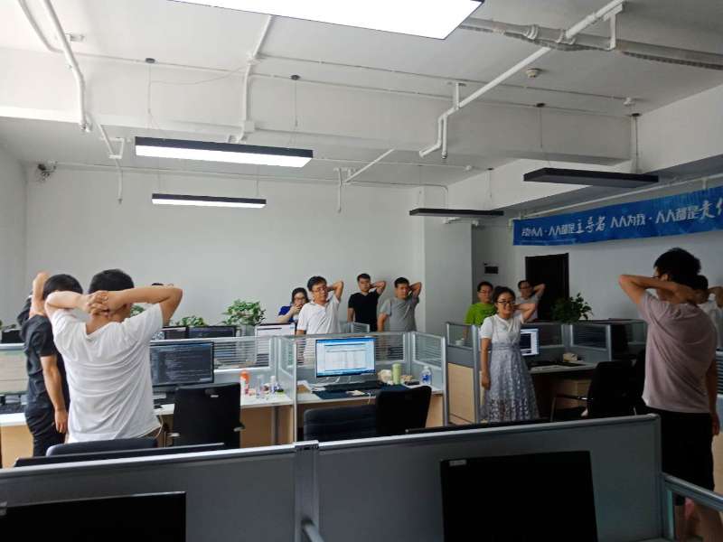在鞍山研發(fā)中心,動畫部的王忠迎、智慧企業(yè)事業(yè)部的閆微首先起身,作為運動大使的她們各自找到一個寬敞、醒目的位置,跟隨著音樂開始將雙手大母指按住后腦風池穴按揉起來。王忠迎和閆微都是團隊的老員工,為公司服務多年,做操這個點子就是她們想出來的。閆微說:“因為工作原因,長期坐著,平時又沒機會運動,一天下來,腰酸背痛,每天拿出幾分鐘時間大家一起做做運動,即運動了身體也放松了心情。